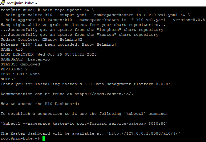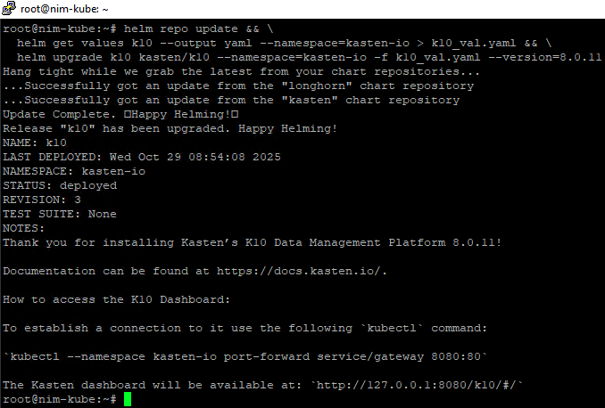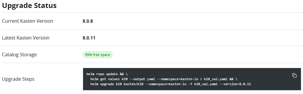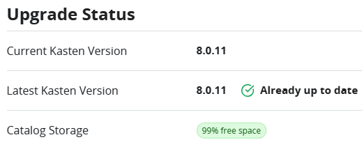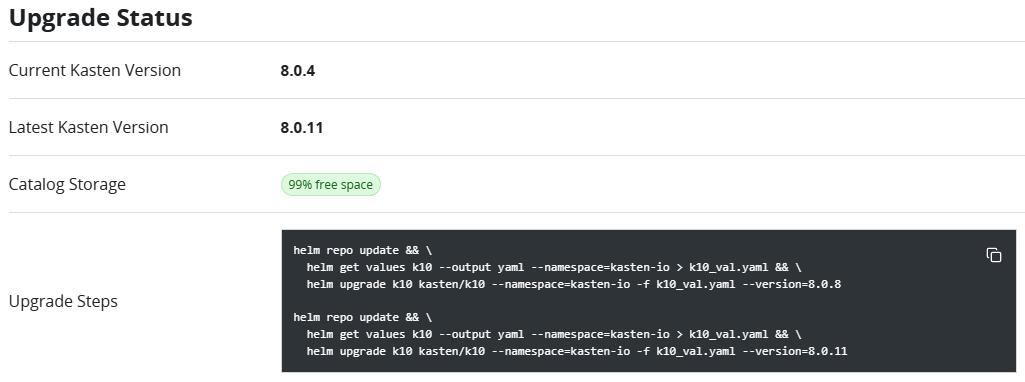 Aguardo os pods serem recriados, acesso a interface web do Kasten e valido que a atualização ocorreu bem. O comando para atualizar da versão 8.0.8 para a 8.0.11 está disponível e apenas repito o mesmo processo.