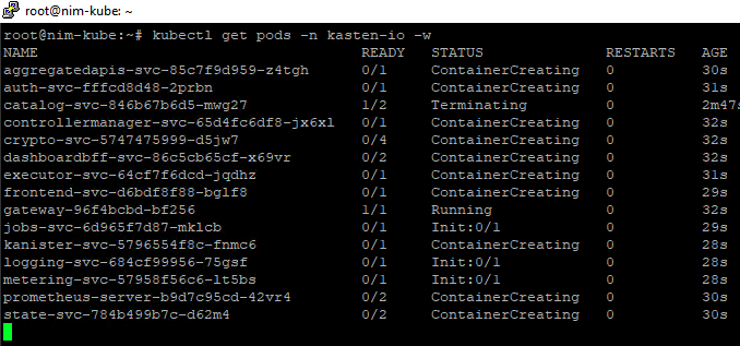 Após executar o comando apenas listo os pods do namespace kasten-io e valido que estão sendo recriados.