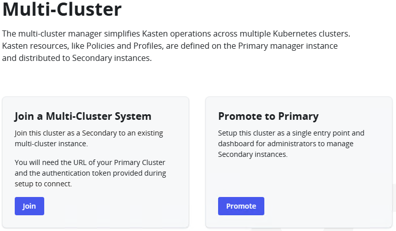 A ideia aqui é mostrar como o gerenciador de múltiplos clusters Kubernetes do Veeam Kasten ajuda na simplificação das operações, fornecendo uma interface unica e diversas opções de configurações compartilhadas entre os cluster gerenciados. O conceito é ter uma instância de Kasten como primária e todas as outras como secundárias. O gerenciamento é realizado pelas instâncias de Kasten e não a nível de Kubernetes, ou seja, é necessário configurar o Kasten localmente em todos os ambientes Kubernetes para depois efetuar a configuração do multi cluster.