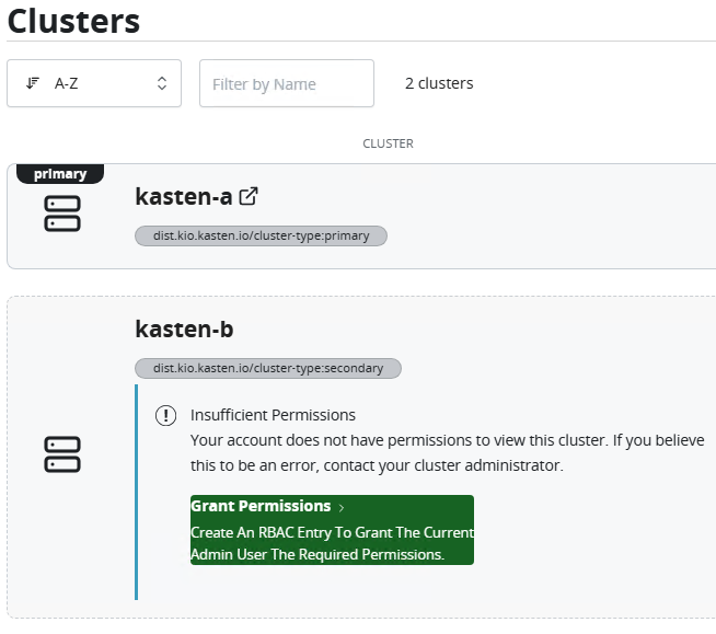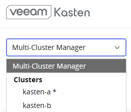 Agora, toda vez que logar no endereço do Veeam Kasten primário (kasten-a), será possível ver este menu com as opções de gerenciamento, tanto para as instâncias locais de Kasten como para o modo de múltiplos clusters.