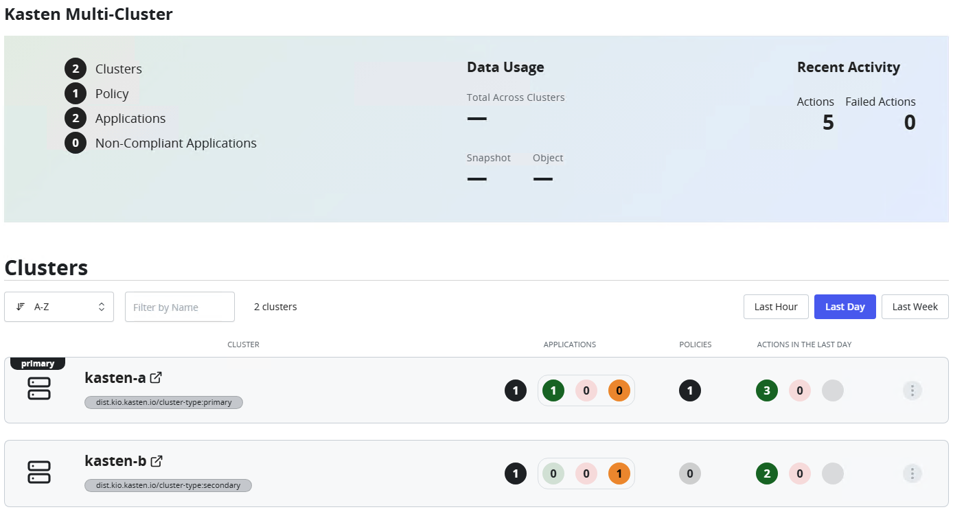 Quando voltar para a parte de gerenciamento de multi-cluster já será possível observar as instâncias de Kasten com as aplicações, politicas e últimas ações. Para gerenciar as instâncias individualmente, basta clicar no nome do cluster para ser direcionado.