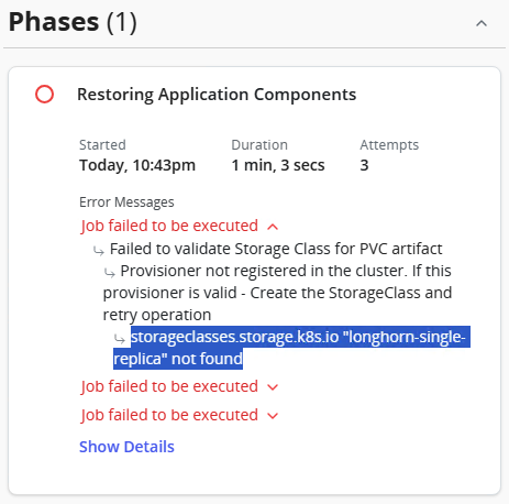 O ambiente de DR é diferente do produtivo e por isso não é possível apenas restaurar. No meu exemplo, o erro especifico foi sobre o storage class, basicamente “longhorn-single-replica” não existe no kubernetes de destino (DR). Poderia ser qualquer outra coisa.