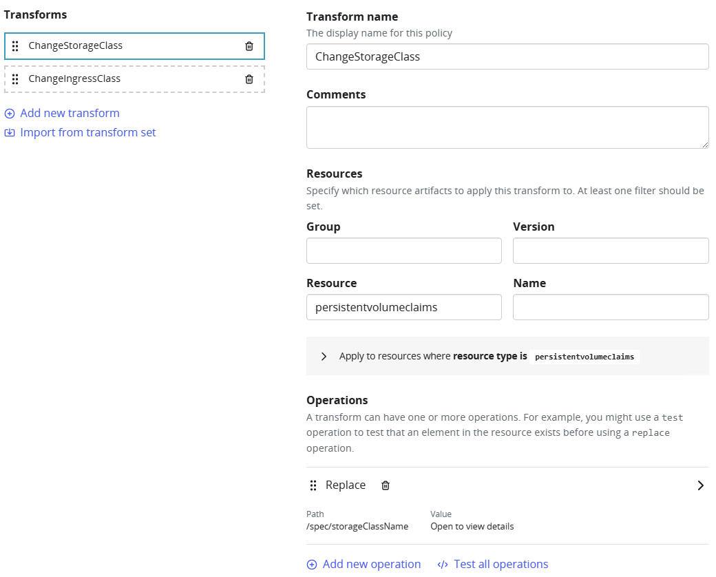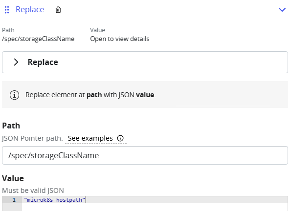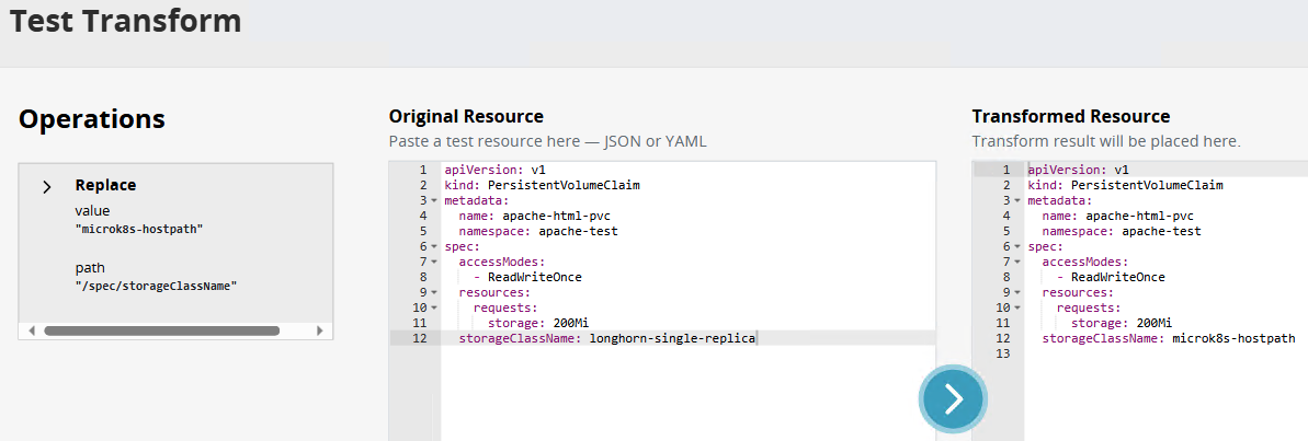 Basicamente defini que vou alterar valores do recurso persistentvolumeclaims no caminho /spec/storage/ClassName e independente do valor que estiver nesse campo, eu quero alterar para “microk8s-hostpath”. E claro que esta storage class precisa existir no meu cluster de destino 🙂
