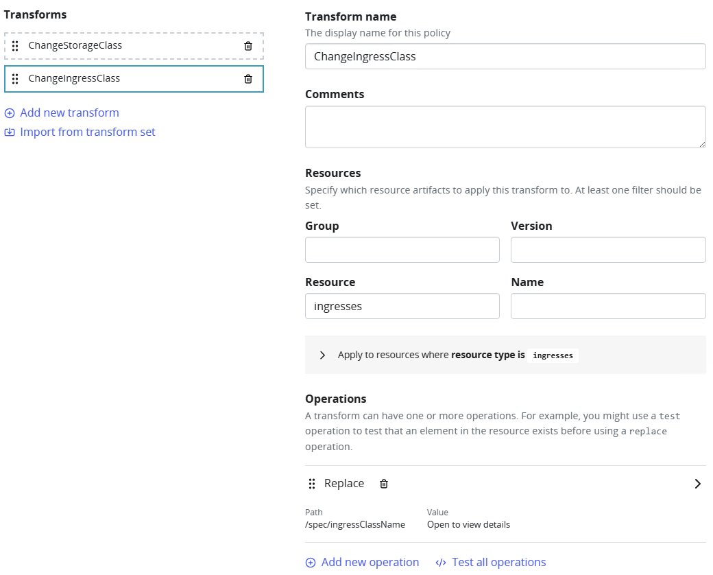Vou fazer algo similar com o ingress. A origem usa traefik, mas o destino usa nginx. Então seleciono o recurso ingresses e substituo o valor existente na propriedade que está em /spec/ingressClassName para “nginx”.